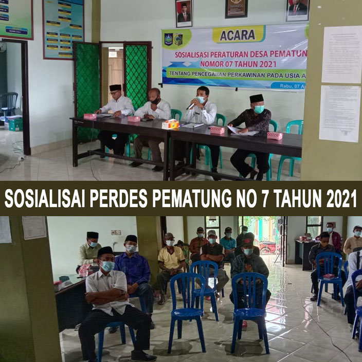 Desa Pematng, 07 April 2021 Pemerintah Desa Pematung telah melaksanakn sosialisasi terkait Peraturan Desa Nomor 07 Tahun 2021 tentang Pencegahan Perkawinan Pada Usia Anak/usia dini atau yang berumur dibawah 19 Tahun hal semacam ini dilakukan oleh Pemerintah Desa guna menginformasikan kepada masyarakat karena dipandang perlu untuk ditertibkan agar supaya Peraturan Desa ini bisa diterapkan di sistem pelaksanaan perkawinan kedepannya ujar Pak Kepala Desa Pematung saat membuka Acara Sosialisasi tersebut.