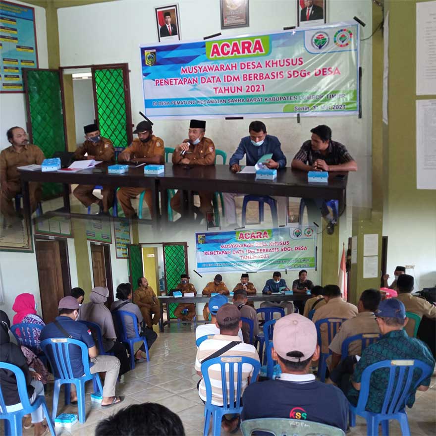 Desa Pematung 31 Mei 2021, Pemerintah Desa Pematung telah melaksanakan Musyawarah Desa Khusus Penetapan IDM Berbasis SDGs Desa Tahun 2021 yang mana pada awal pembukaan yang langsung disampaikan oleh Bapak Camat Sakra Barat bahwa Desa Pematung ternyata adalah Desa Pertama yg sudah selesai atau 100 % melakukan Pendataan SDGs di kecamatan Sakra Barat Kabupaten Lombok Timur pada Tahun 2021 tentu ini merupakan apresiasi yang sangat luar biasa yang patut dibanggakan ternyata Pemerintah Desa Pematung sangat mendukung proses pelaksanaan Pendataan SDGs sehingga paling pertama selesai melakukan pendataan.